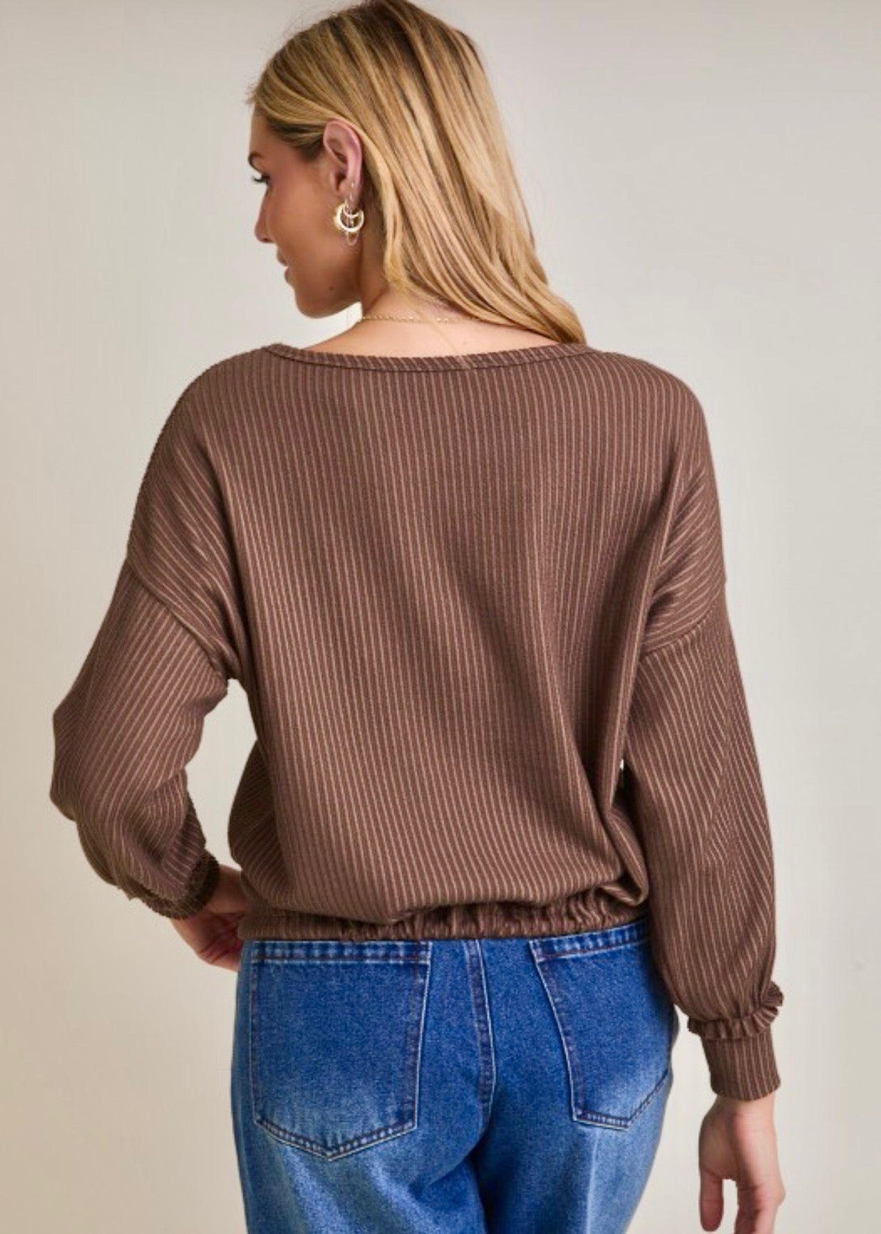 This laid-back brown long sleeve brings comfort with a touch of style, featuring a loose silhouette and gathered bottom hem. It’s the go-to top for casual days that still call for a little flair!